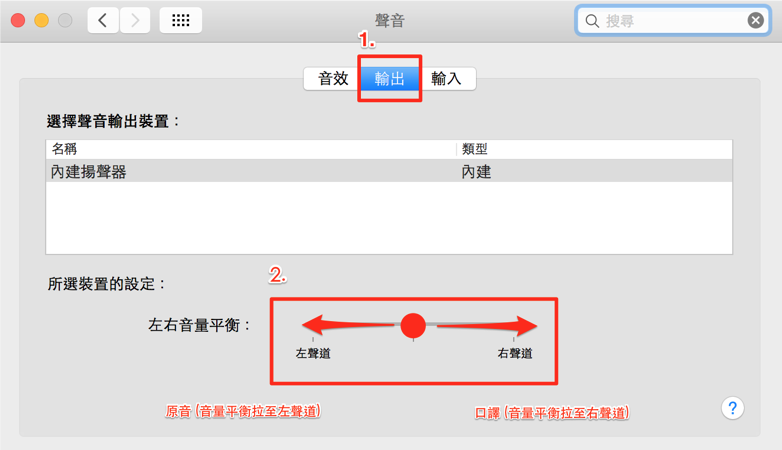 b. 口譯聲音 : 將「左右音量平衡」 拉至右聲道最右