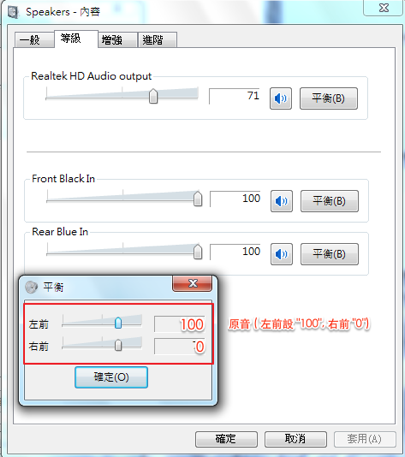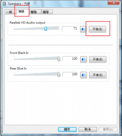 4.在 「內容」點選 「等級」頁面,即可看到音效輸出的設定