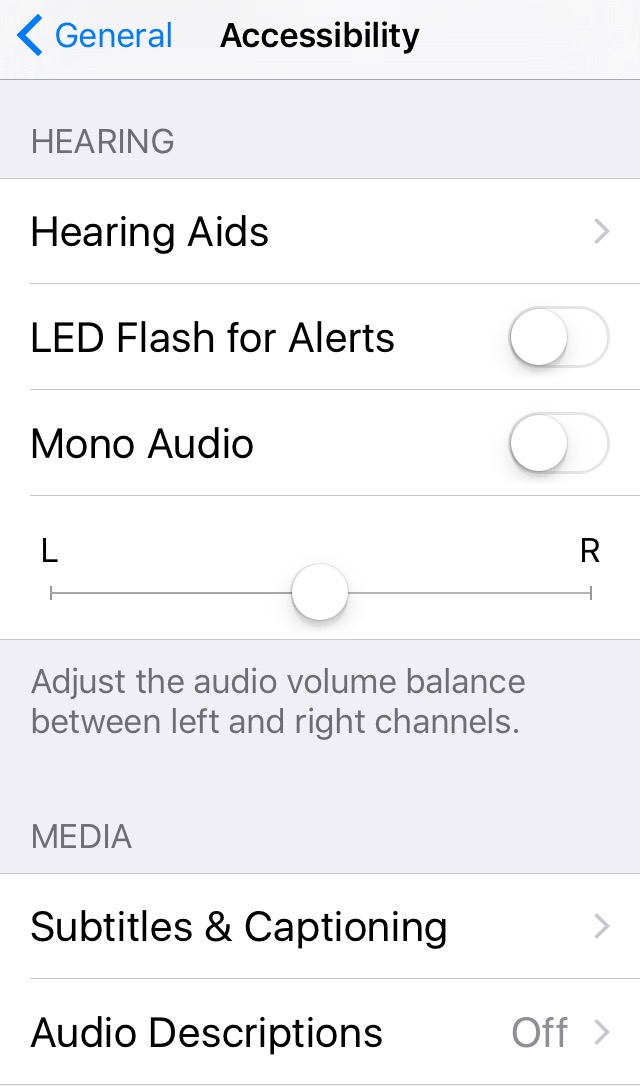 在「輔助使用」裡面的「聽力」部分調整左右聲道的音量平衡。(設定 > 一般 > 輔助使用)