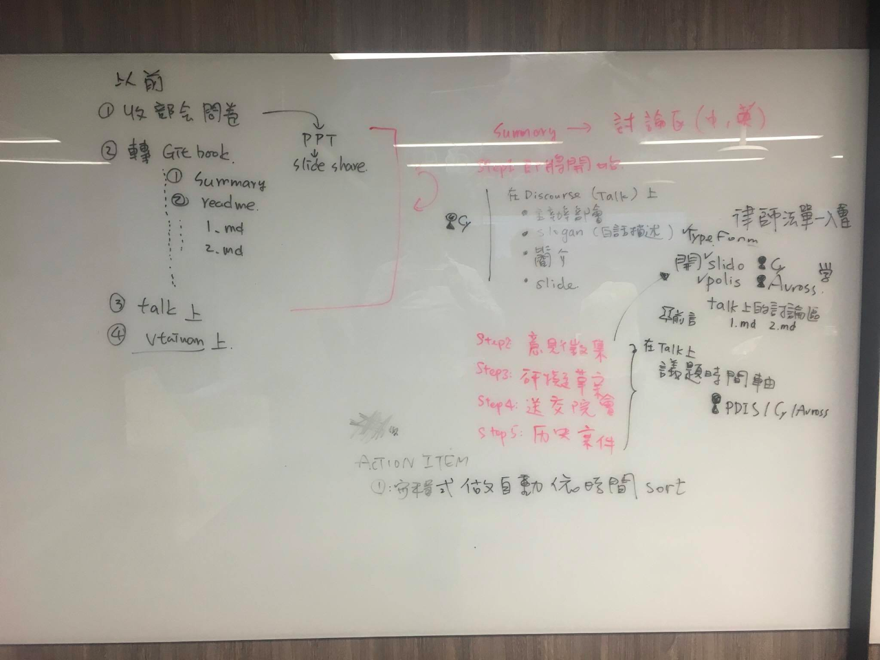 | 1) | 收部會問卷 | ppt -> slideshare | step 1: 即將開始 | 在Discourse上: | 請 Cy 學 Discourse 使用 |