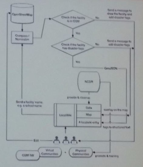 這個概念圖很複雜,但是我前面都講過了。要進去LocalWiki的時候,要先查一下有沒有這個地名的頁面,如果有就去編輯,如果沒有就新開。然後再去OSM裡面找一下是否已經有這個地方,如果有的話就直接import到 LocalWiki,如果沒有的話會發訊息給開發者請他去OSM裡面輸入資料。這樣資料就可以匯集在一起。但這還是在概念的層級,實作面我們還沒開始進行。一個防災社區的樣版大概具有社區基本資料、社區有哪些避難場所、有哪些設備、緊急聯絡網?都必須是基本資訊。年底之前我們會來做釋出。這不只在防災社區使用,這樣的方法應該可以擴充到更多議題上使用。
