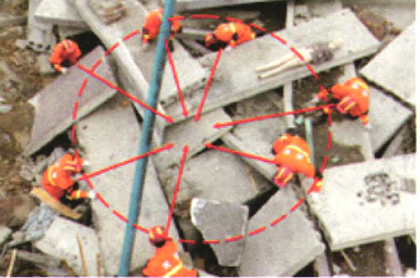 人工環形搜索:用於大致判斷受困者位置,定位使用沿廢墟定位,逐漸向中心定位