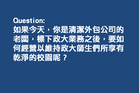 如果今天,你是清潔公司的老闆,標下政大業務之後,要如何經營才能維持所有政大師生都享受乾淨的校園呢?答案是:什麼都不用做。