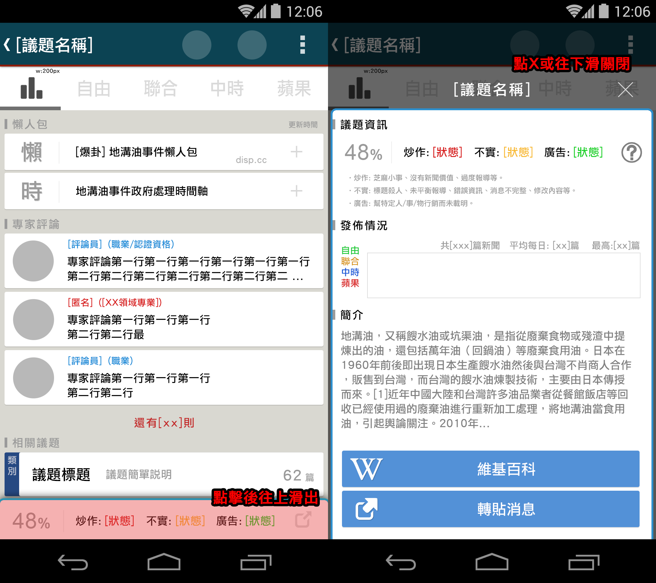 嗨嗨你好,很高興也有朋友在構思如何利用好平台改善媒體環境,你說的問題我們做到最近也開始思考,不過方向略有不同,因為資源不是很夠,現在重心放在回饋較確實的功能(考慮到防弊防洗版的問題就複雜很多),你提的如果可以整合當然很好,我們團隊也需要規劃功能面的人,可以多多交流討論! 最後附上一張議題資訊頁的Mock up給你參考。(這是很理想的狀態了,某些附加資訊如果要避免品質低落就還是需要人工管理)