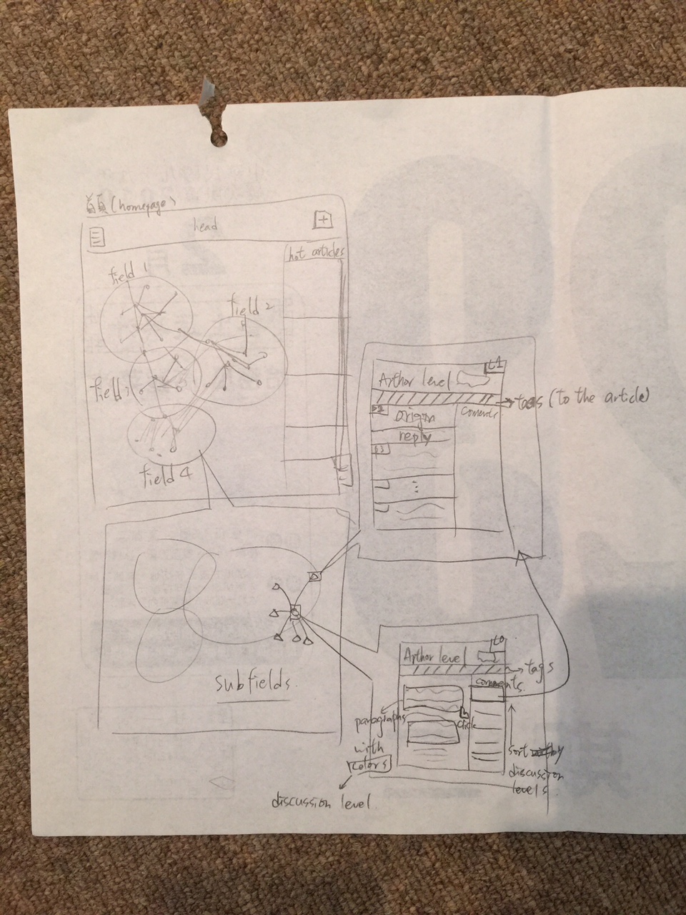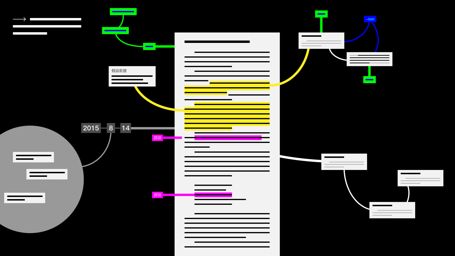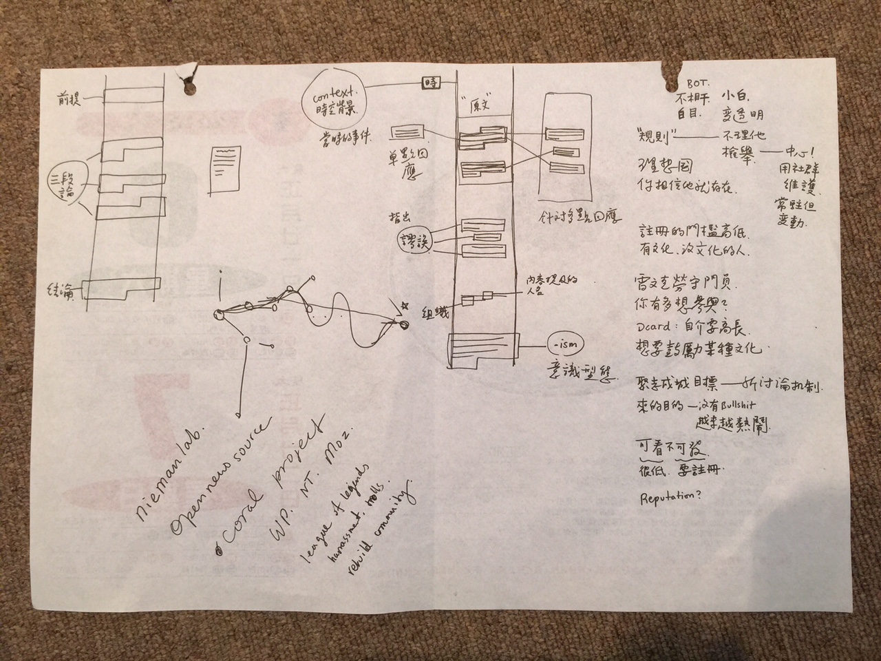 - 除了基本的段落式線型文字編輯器之外,以增進議論效能為目的,設計文圖編排格式與互動方式(例如:逐段回覆、提出疑問、提出反方論點等等,以不同的介面視覺化。)