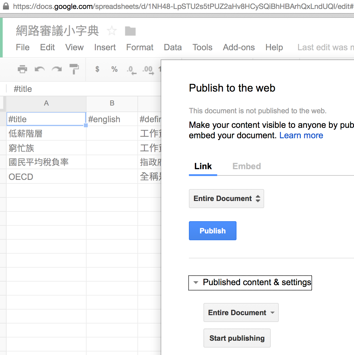 在 Google Spreadsheet 裡,複製 vTaiwan 小字典(File -> Make a Copy -> Move to Drive),將頁籤名稱改成與討論議題同名,再按 Publish: